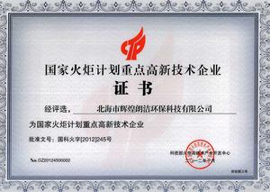 Certificate of national torch plan key high-tech enterprise | National ministries and commissions | 2012-10 | Ministry of Science and Technology torch high and new technology industry development center |